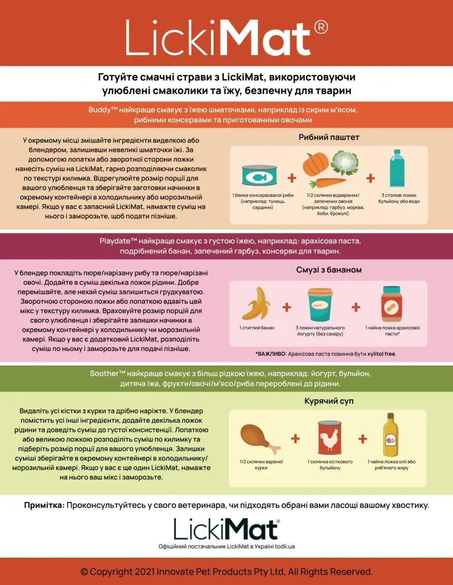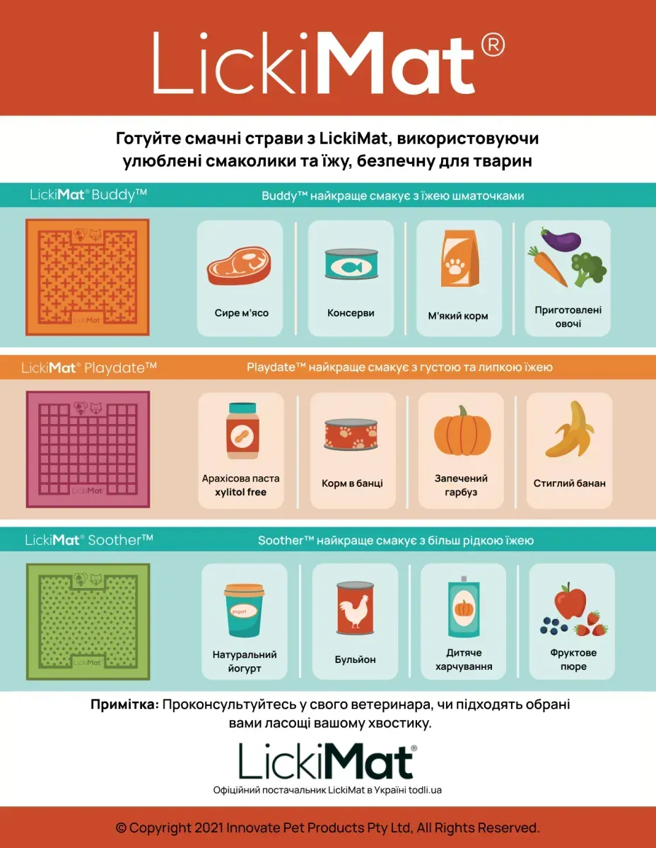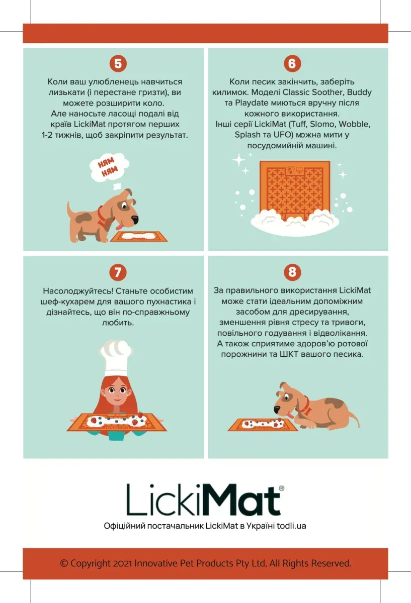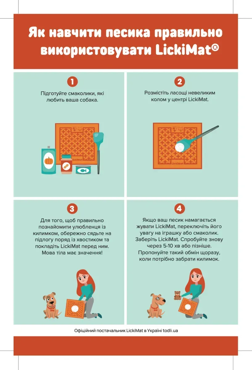 - Будь ласка, спостерігайте за улюбленцем в перші кілька разів використання LickiMat, поки не переконайтеся, що він не жуватиме килимок;