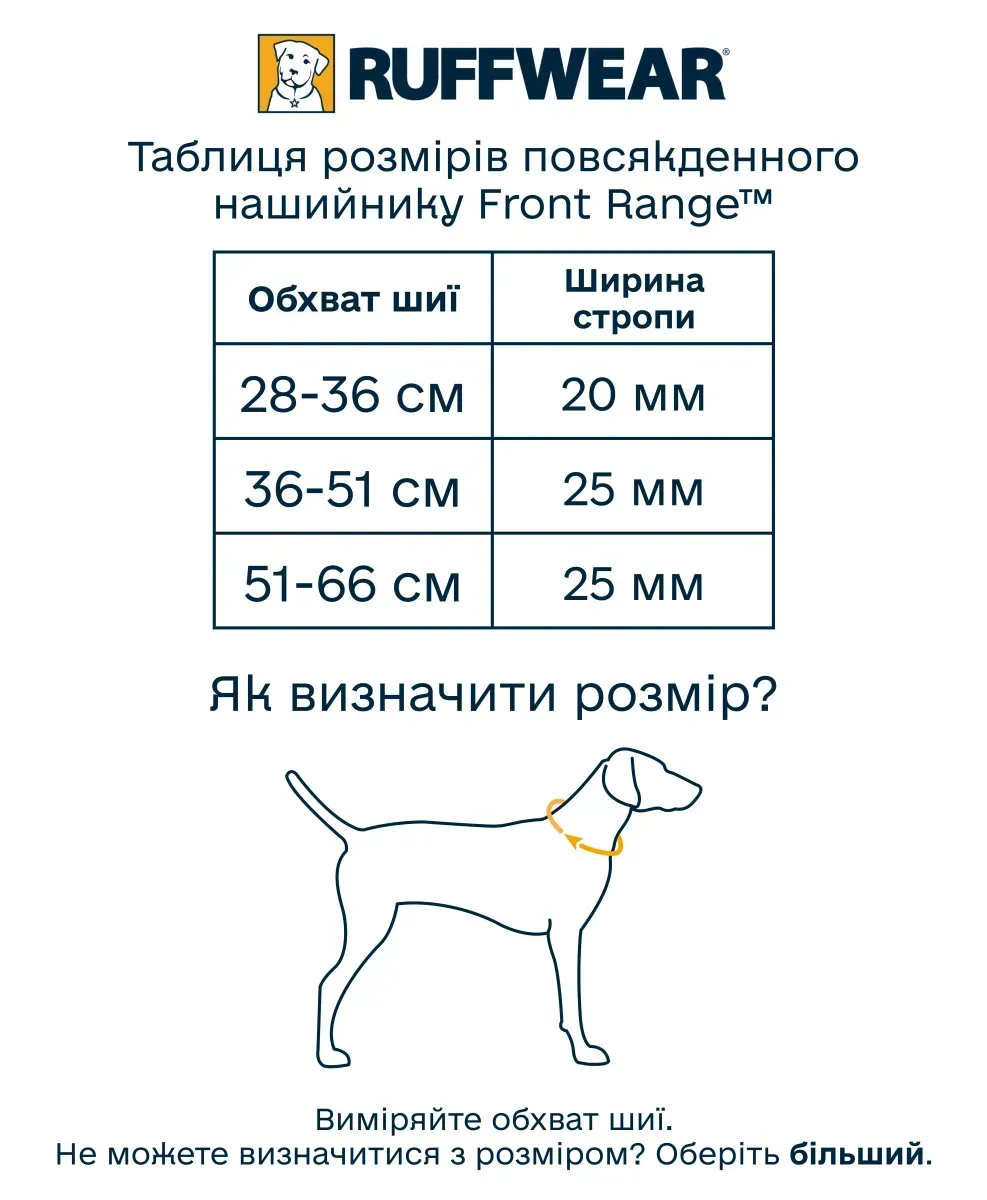 У нашийнику Front Range використовується перероблений матеріал для зниження негативного впливу на навколишнє середовище. Стропа Tubelok™️ стійка до вицвітання і має високий ступінь довговічності, бічна пряжка забезпечує зручність використання, а алюмінієве V-подібне кільце гарантує надійне кріплення повідця.