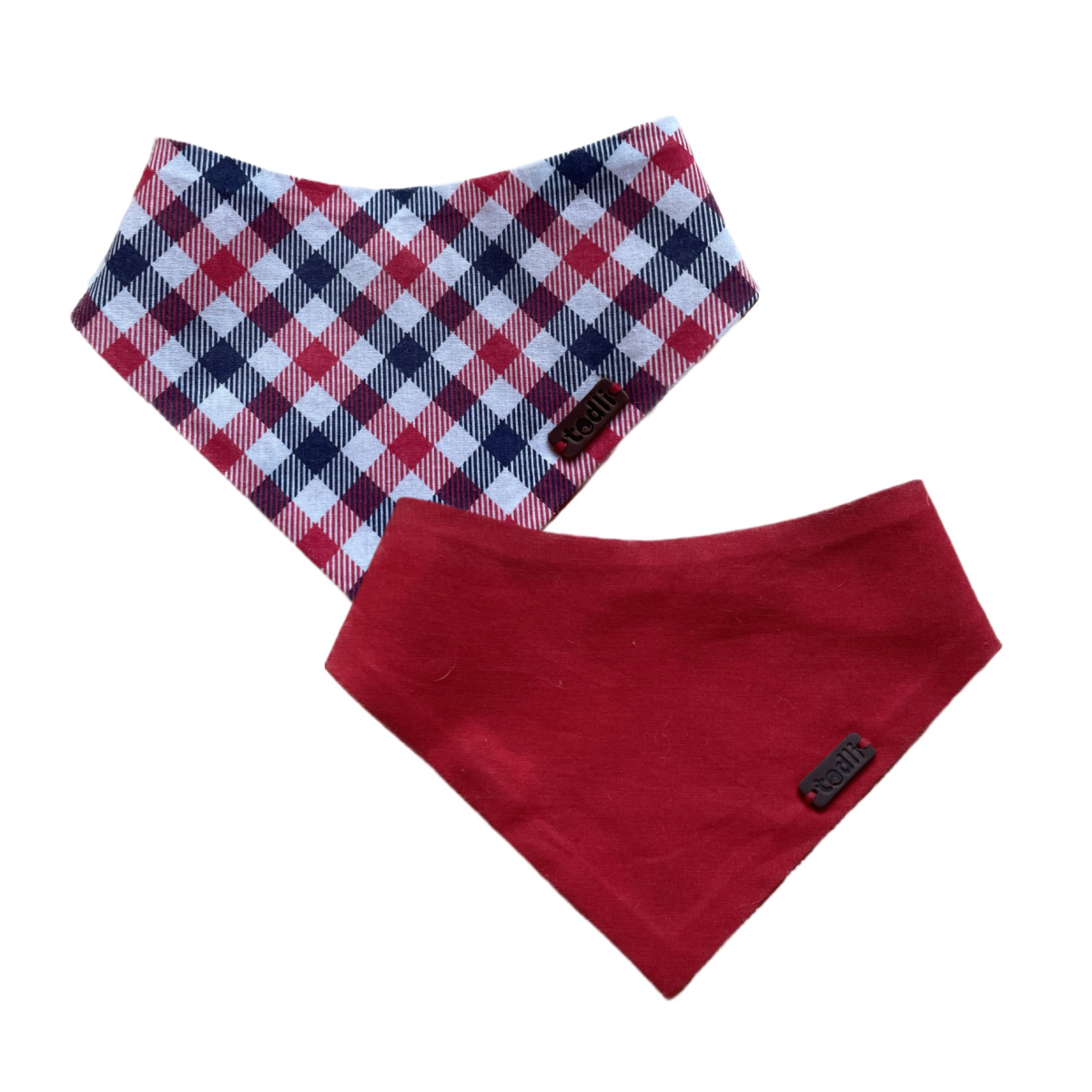 Аксессуар выполнен в виде двухсторонней банданы, где одна сторона красного цвета, а вторая выполнена из ткани в красно-синюю клетку. Достаточно спокойное, но яркое изделие, что выполнено из 100% хлопка. Тональность цветов подобрана так грамотно, что бандану можно носить с отворотом, например, одевая ее цветной стороной вы можете сделать небольшой отворот однотонной части на лицо и наоборот, тем самым прибавить внешнему виду добавочной стоимости. Застегивается бандана на двойные кнопки, что гарантирует надежную фиксацию даже на очень активных собаках. Лекало разрабатывалось с единой целью - удобности носки для питомца, поэтому горловина вогнутая, не пережимает шею собаки. С обеих сторон на аксессуаре вручную пришита кожаная фирменная бирка с оттиском.