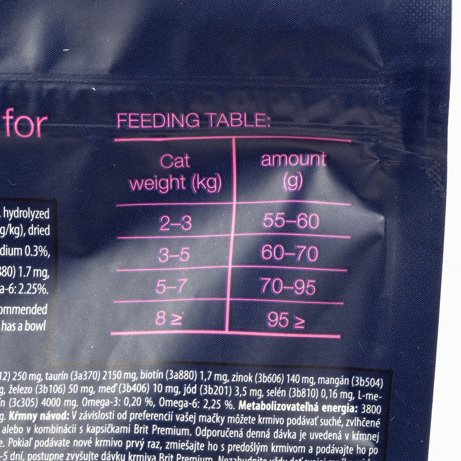 Харчові добавки на 1 кг: вітамін А (3a672a) 20000 МО, вітамін D3 (3a671) 850 МО, вітамін E (3a700) 600 мг, вітамін C (3a312) 250 мг, таурин (3a370) 2150 мг, біотин (3a880) 1,7 мг, цинк (3b606) 140 мг, марганець (3b504) 50 мг, залізо (3b106) 50 мг, мідь (3b406) 10 мг, йод (3b201) 3,5 мг, селен (3b810) 0,16 мг, L-метіонін (3c305) 4000 мг. Омега-3: 0,20%, Омега -6: 2,25%.